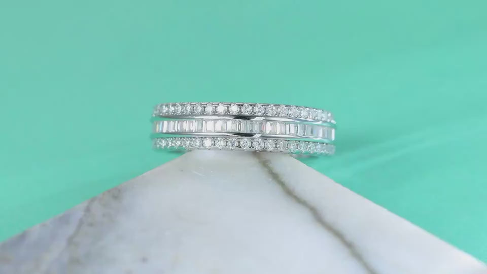 Das dreireihige Moissanit-Silberring-Set vereint zeitlose Eleganz mit moderner Handwerkskunst. Drei Reihen funkelnder Moissanit-Steine in hochwertigem 925er Sterlingsilber verleihen diesem Ring ein luxuriöses Funkeln, das die Blicke auf sich zieht.